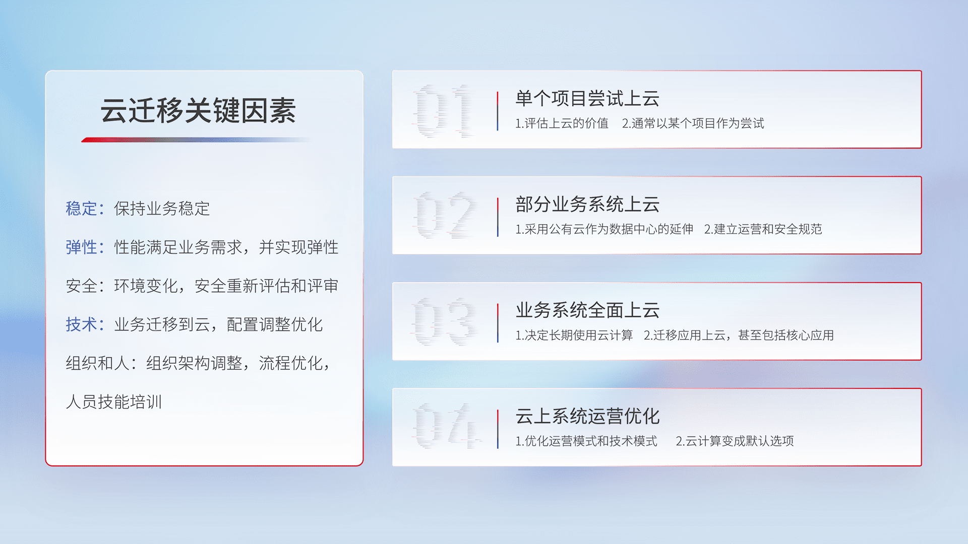 结合实际业务,,从规划设计、、、云平台选型、、、、云原生改造、、数据迁移、、、、集成交付,,,迁移全过程为客户识别最佳上云路径,,做好风险识别管理,,,,设计网络架构、、、、身份权限、、、、安全审计合规、、、操作审计、、、日志审计、、、监控告警策略、、多站点容灾设计等,,,,对云上基础设施进行整体规划,,,,提升IT治理水平,,,,以满足弹性、、、高可用、、高性能的需求。。