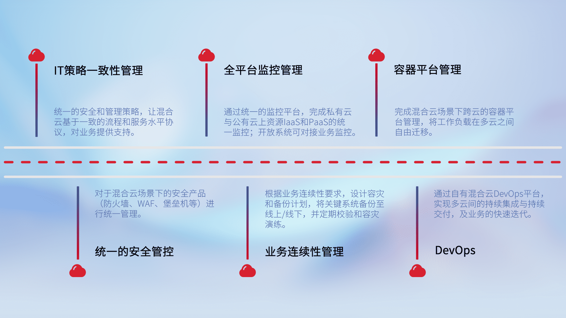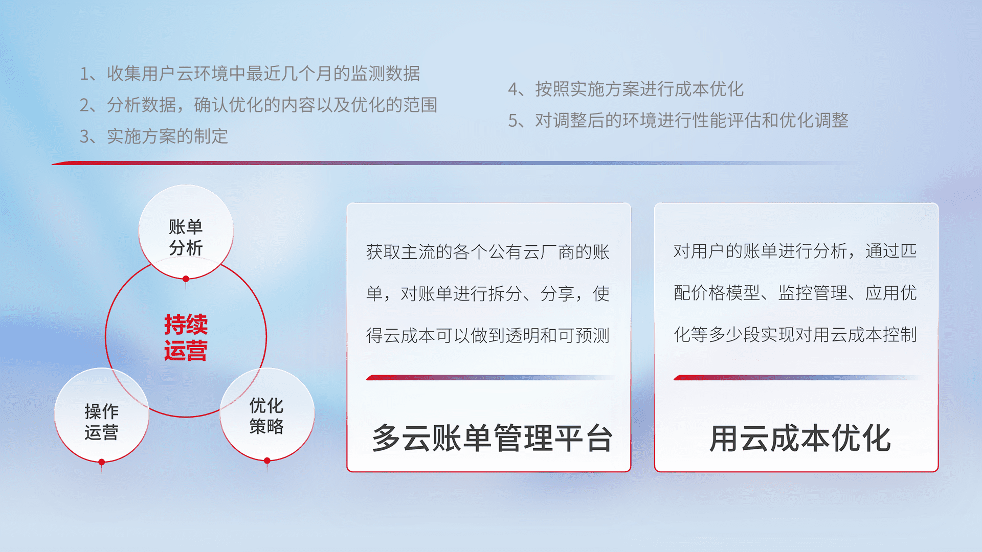通过多云纳管,,,,以统一的资源数据模型把客户的云资源进行抽象和封装,,进而实现对多云资源的统一操作,,,保障云资源管理的可靠性、、稳定性与可用性。。。。量身定制化运维内容,,,,配置、、、开发运维、、补丁管理、、、备份、、、监控、、认证和访问管理、、、审计和日常巡检等,,保障在用云过程中的可靠度,,稳定度以及高可用率。。。