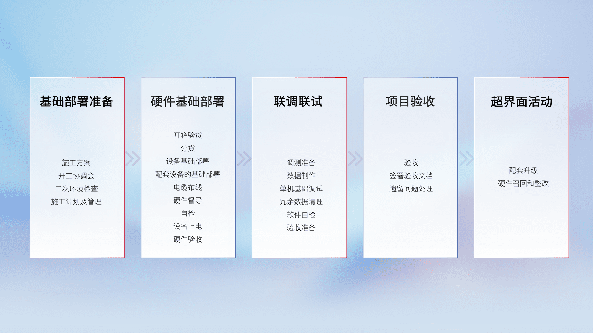 从基础部署准备、、硬件基础部署、、联调联试、、、、项目验收、、越界面活动的全过程可追溯,,保证施工质量和进度。。。